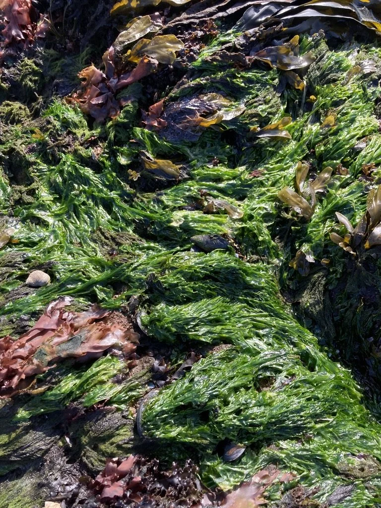 Tidepool Tim says, “Polysiphonia grows on knotted wrack like a little hitchhiker. It does no harm to the Ascophyllum it just uses it as a place to attach and grow - kind of like vines growing on large trees in the rainforest. In order to find this tufted weed, I must search and search along the beaches in the large knotted wrack beds. this is very slippery work and i tend to frequently fall off my feet. Sometimes it is very easy to locate and at other times it may take an hour to find the right place and spot the little tufts hanging from the rockweed. This seaweed is an epiphyte.”